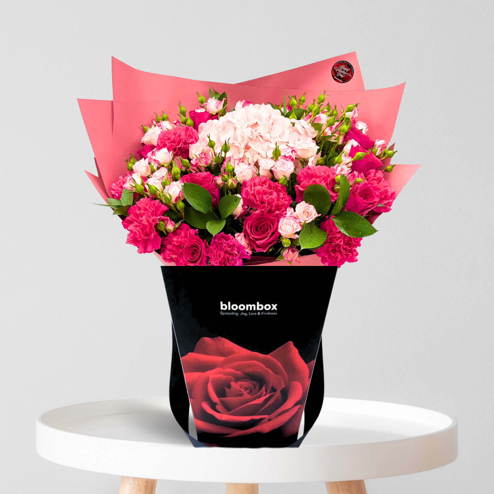 Celebrate love this Valentine’s Day with a refined blush bouquet featuring soft hydrangeas, elegant roses, delicate carnations, and lush greenery beautifully finished in bold red wrapping for the perfect romantic statement.