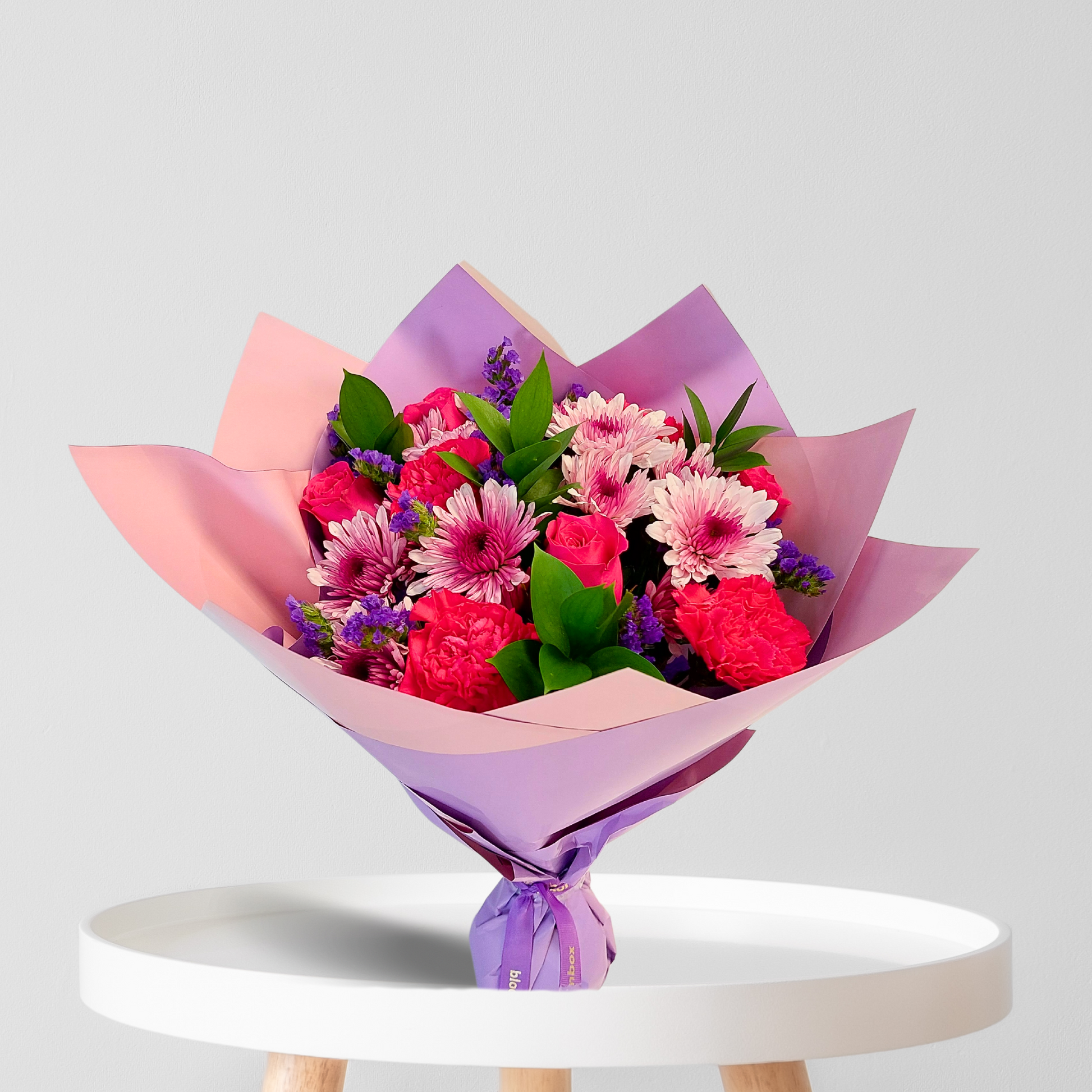 Grace meets grandeur with our Elegant Bloom Bouquet, a mesmerizing blend of rich purple hues that exude sophistication and charm. Symbolizing admiration and elegance, these blooms create a striking statement, perfect for any occasion.