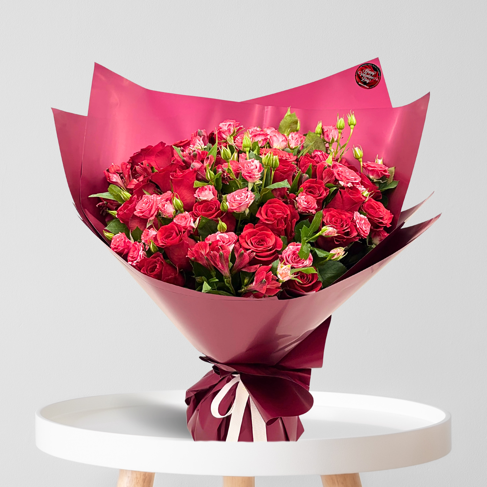 Make a bold romantic statement this Valentine’s Day with a vibrant mix of red roses, fuchsia spray roses, and alstroemeria designed for a passionate, expressive, and unforgettable look.